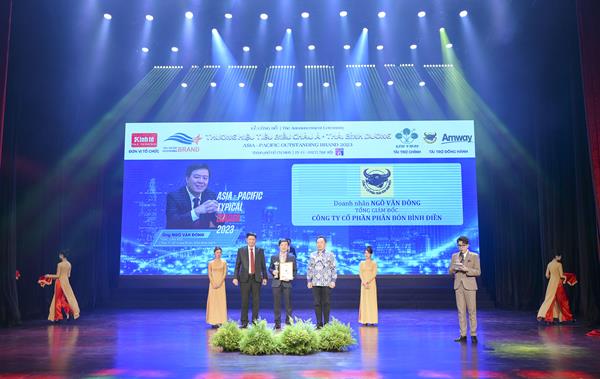 Tại Giải thưởng năm nay, Công ty Cổ phần Phân bón Bình Điền vinh dự được vinh danh ở hai hạng mục: “Top 5 Thương hiệu tiêu biểu châu Á – Thái Bình Dương” và ông Ngô Văn Đông – Tổng giám đốc Công ty được vinh danh ở hạng mục “Doanh nhân tiêu biểu châu Á – Thái Bình Dương”.